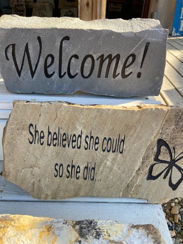 Are you interested in a stone with your name on it? Or how about a stone engraved with your business or cabin logo? Maybe a pet memorial? Come place your custom order while you camp or shop from the many stones I have on sight.